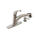Delta Faucet Company 467-SSSD-DST Palo Diamond; Seal Technology Pull-out Kitchen Faucet, StainlessThe Delta Faucet Company creates products with the highest level of quality and technological advancement. Their products and services offer the highest levels of design, performance and aesthetics. Delta Faucet Company 467-SSSD-DST Palo Diamond; Seal Technology Pull-out Kitchen Faucet, Stainless, Features:; Palo features organic curves, smooth lines, and Inviting design; The Palo pull-out adds functionality with style; Snug-fit connection holds wand firmly in base; Pull-out spray wand provides 38? reach, maximizing work space; Coordinating soap or lotion dispenser included; Lifetime Faucet and Finish WarrantyDelta Faucet Company 467-SSSD-DST Palo Diamond Seal Technology Pull-out Kitchen Faucet, Stainless Features:; Model #: 467-SSSD-DST; 2 or 4-hole 8" installation; Number of Handles: 1 ; Tall/High-Arc: No ; Pull-out/Pull-down: Yes ; With Side Sprayer: No ; Valve Type: DIAMOND(TM) Seal Valve ; Hose Length: 59" long hose ; Holes/Width: 2 or 4-hole 8" installation ; DIAMOND; Seal Technology; Brilliance; Finish; With Soap / Lotion Dispenser; CA/VT Compliant Read more