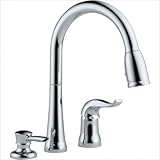 16970-SD-DST Finish: Chrome Pictured in chrome Features: -Kitchen faucet with soap dispenser. -Deck mount. -Diamond seal technology valve. -Includes matching soap or lotion dispenser. -Integrated supply tubes. -Magnatite docking system. -2 Function pull down kitchen faucets for exposed mounting on three hole sinks. -Control handle shall return to neutral position when valve is turned off. -Red and blue graphics on handle button to indicate hot and cold temperature. -Certified double check valves in sprayer assembly for backflow prevention. -Disposable hose lead to aid installation. -Touch clean sprayhead. -Magnetic docking system secures sprayer to spout. -Requires 2 or 4 hole drilling and 8'' installation. -Spout swings 360 degree. Specifications: -ADA compliant. -CA / VT compliant. -ASME A112.18.1 / CSA B125.1 listed. -Delta provides lifetime faucet and finish limited warranty. -Delta provides 5 Year limited warranty for usage. -0.37'' O.D. straight. -Staggered pex supply tubes are 35'' and 36'' long. -Overall dimensions: 14.312'' H x 4'' W x 9.25'' D. For more information on this product please view the Sheet(s) below: Technical Specifications Maintenance and Installation Sheet Read more